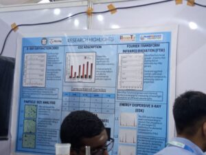 📌 A vibrant display of research posters showing: – High crystallinity of HAp verified via XRD.