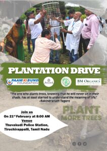 Planting trees is one of the most effective ways to protect the environment and combat climate change. On February 21 at 8:00 AM, a Plantation Drive was organized at Thuvakudi Police Station in Tiruchirappalli, Tamil Nadu to promote environmental conservation and increase green cover in the region.